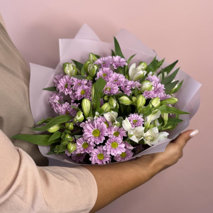 На фото букет «сиреневая соната». В составе: альстромерия 3 шт, хризантема кустовая 5 шт, дизайнерская упаковка 1 шт, атласная лента 1 шт, . Все цветы свежие и ароматные, букет красиво оформлен и отлично подходит для подарка. Доступна доставка цветов или самовывоз.